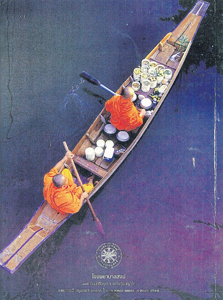 ผู้เขียนเห็นภาพปกหลังหนังสืออนุสรณ์ครบรอบ 52 ปี (21 ก.พ. 2546) โรงพยาบาลสงฆ์ เป็นภาพพระภิกษุ 2 รูป พายเรือบิณฑบาต ทำให้รำลึกถึงอดีตที่บ้านเมืองยังมีน้ำเต็มแม่น้ำลำคลอง โดยเฉพาะต่างจังหวัดในภาคกลางจะเห็นพระสงฆ์ในวัดต่างๆ ส่วนมากตั้งอยู่ริมฝั่งแม่น้ำพายเรือออกบิณฑบาตกันเป็นประจำ เพราะบ้านญาติโยมส่วนมากก็ตั้งอยู่ริมน้ำเช่นกัน