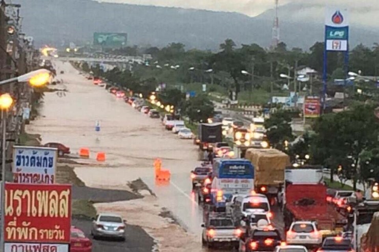 นครราชสีมา-ฝนตกหนักน้ำป่าจากเขาปืนแตกหลากท่วมถนนมิตรภาพบริเวณอำเภอสีคิ้ว ขาเข้ากรุงเทพมหานครสูง20-40ซม.การจราจรติดขัดหนัก