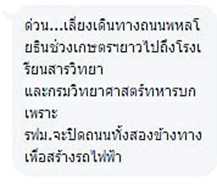 ตามที่มีการแชร์ในไลน์ว่า เลี่ยงการเดินทางผ่านถนนพหลโยธิน ช่วงเกษตรยาวไปถึงกรมวิทยาศาสตร์ทหารบก เพราะจะมีการปิดถนนทั้งสองข้างทางเพื่อสร้างรถไฟฟ้านั้น ได้สอบถามการรถไฟฟ้าขนส่งมวลชนแห่งประเทศไทย ได้รับแจ้งว่า บริษัทผู้รับจ้างก่อสร้างโครงการรถไฟฟ้าสายสีเขียว ช่วงหมอชิต-สะพานใหม่-คูคต จะทำการติดตั้งแบริเออร์ป้องกันในการรื้อย้ายสาธารณูปโภคและก่อสร้าง จึงต้องเบี่ยงการจราจรบนถนนพหลโยธินบริเวณหน้ากรมป่าไม้ ถึงปากซอยพหลโยธิน 47 และหน้าโรงเรียนสารวิทยา ถึงกรมวิทยาศาสตร์ทหารบก