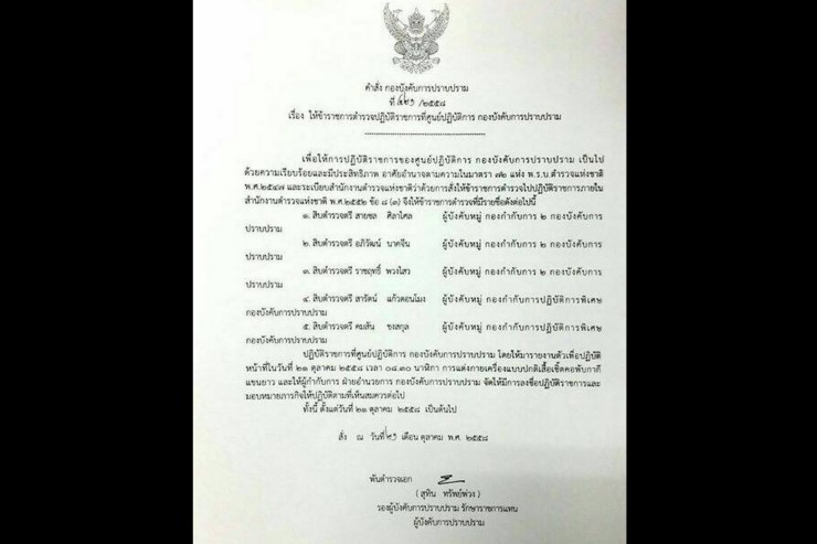เมื่อวันที่ 21 ต.ค. เวลา 19.00 น. พ.ต.อ.สุทิน ทรัพย์พ่วง รองผู้บังคับการกองปราบปราม ในฐานะรักษาราชการแทนผู้บังคับการกองปราบปราม ได้ลงนามในคำสั่งที่421/2558 เรื่องให้ข้าราชการตำรวจไปปฏิบัติราชการที่ศูนย์ปฏิบัติการกองบังคับการปราบปราม (ศปก.) โดยมีใจความว่า