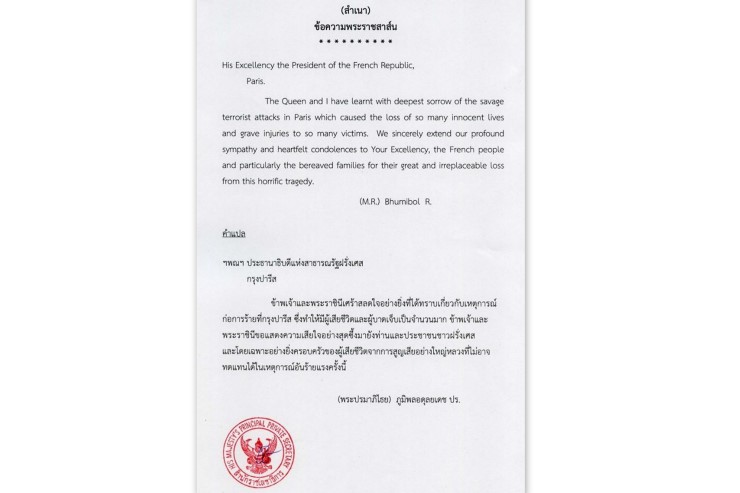 ในหลวง-พระราชินีทรงมีพระราชสาส์นแห่งความเสียพระราชหฤทัย ถึงประธานาธิบดีฝรั่งเศสกรณีเหตุการณ์ก่อการร้ายที่กรุงปารีส