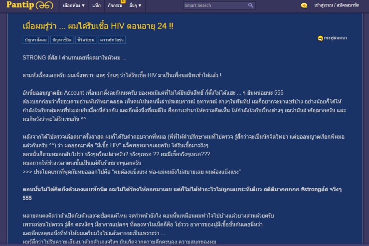 สมาชิกเว็บไซด์พันทิป หมายเลข 2497597 โพสต์กระทู้ชื่อ "เมื่อผมรู้ว่า ... ผมได้รับเชื้อ HIV ตอนอายุ 24 !!" นำเสนอเรื่องราวประสบการณ์ชีวิตสุดเเข็งเเกร่ง หลังจากทราบว่าตัวเองได้รับเชื้อ HIV ซึ่งเขาพยายามค้นหากำลังใจเเละบอกตัวเองเสมอว่าต้องสู้ต่อไป โดยการติดเชื้อไม่ได้เลวร้ายไปซะทั้งหมด กลับกันยังทำให้มองอะไรที่เเตกต่าง รวมทั้งได้รับสิ่งดีๆ กลับมามากมายด้วย ตัวอย่างเช่น