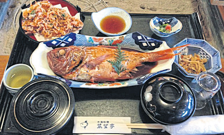 เรานั่งรถไปราวๆ 15 นาที ก็ถึงที่ร้าน Manboutei (อ่านว่า มัมโบเท) ที่มีรูปปลาพระอาทิตย์เหมือนชื่อร้านเป็นสัญลักษณ์ให้เห็นเด่นแต่ไกล แน่นอนว่าอาหารจานหลักของที่นี่ก็คือปลา และปลาเด่นของร้านนี้เห็นทีจะไม่มีใครเกิน ปลา Kinmedai ซึ่งเป็นปลาขึ้นชื่อของแถบ Izu ปลาคิมเมไดเป็นหนึ่งในหลายชนิดของสายพันธุ์ปลาไท (Tai) หรือปลากะพง ถือว่าเป็นปลาชั้นดีลำดับต้นๆ ของตระกูลเลยก็ว่าได้ เพราะราคาเหนือชั้นกว่าญาติๆ ส่วนใหญ่ ส่วนรสชาติก็น่าจะใกล้เคียงกับปลากะพงแดง