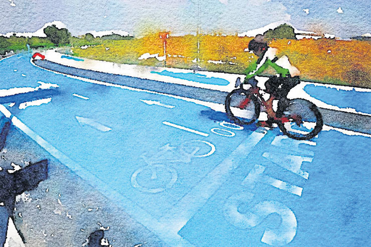 มันเป็นเวลาบ่ายสองโมง คนน้อย สนามโล่ง ถนนลาดยางมะตอยทาสีฟ้าโดดเด่น ตีเส้นแบ่งเป็นสองเลนสำหรับปั่นช้ากับปั่นเร็ว ทัศนียภาพของข้างทางให้ความรู้สึกเหมือนปั่นอยู่ริมบึง ซ้ายมือเป็นสระน้ำใหญ่ทอดยาว อาคารผู้โดยสารสนามบินสุวรรณภูมิตั้งตระหง่านอยู่ลิบๆ ฝั่งขวาเป็นเนินหญ้าเขียว มีบ้านเรือนตัดสลับกับแนวต้นไม้เป็นฉากหลัง