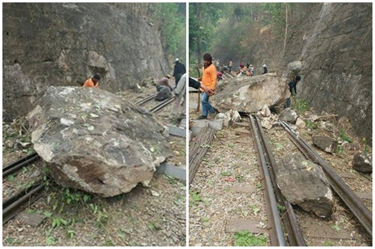 หินขนาดใหญ่หล่นทับทางรถไฟถ้ำกระแซ จ.กาญจนบุรี