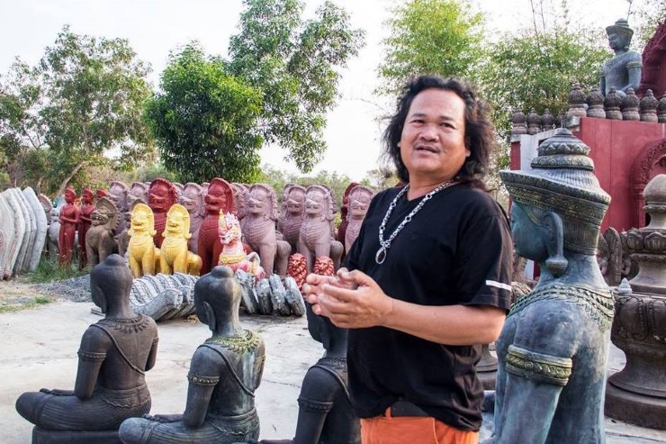 ประติมากรรมลายปั้นศิลปะขอมที่เราเห็นกันในฉากภาพยนตร์ หรือละครโทรทัศน์หลายๆ เรื่องเป็นงานที่สร้างขึ้นมาใหม่ โดยฝีมือของ ชัยวัชระ ประยงค์หอม หรือ “ช่างน้อย ร่มบิน” วัย 51 ปี เจ้าของร้านลายไทยรุ่งเรืองริมถนนสาย 214 ถนนปราสาท-กาบเชิง อ.ปราสาท จ.สุรินทร์
