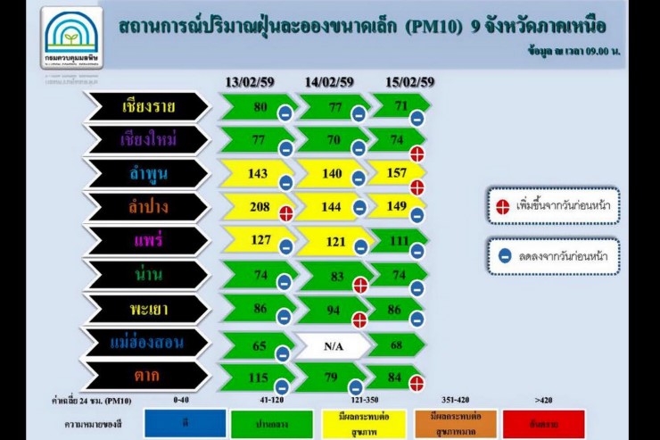 กรมควบคุมมลพิษ(คพ.) รายงานปริมาณฝุ่นละอองขนาดเล็ก (PM10)จากการเผาเผาป่า ใบไม้ ไร่นา จนเกิดพิษหมอกควันในพื้นที่ภาคเหนือ ที่เริ่มตรวจวันตั้งแต่ช่วงเวลา เวลา 09.00 น. ของวันที่ 15 ก.พ. พบว่า ปริมาณฝุ่นละอองสูงสุดอยู่ที่ 157 มคก./ลบ.ม. ที่จ.ลำพูน และเกินค่ามาตรฐานอยู่ที่ จ.ลำพูน และลำปาง โดยส่วนใหญ่ฝุ่นละอองมีแนวโน้มลดลง ยกเว้นจังหวัดลำพูน เชียงใหม่ และตาก ที่ฝุ่นละอองเพิ่มขึ้นเล็กน้อย คุณภาพอากาศอยู่ในระดับปานกลางถึงมีผลกระทบต่อสุขภาพ