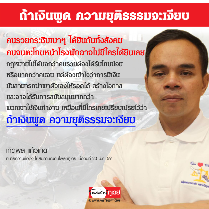 “เรื่องพวกนี้เป็นเรื่องของเงินล้วนๆ ไม่ทางตรงก็ทางอ้อม คนจนไม่มีเงิน ไม่มีพวก บางรายไม่มีความรู้อีก คนรวยกระซิบเบาๆ ได้ยินกันทั้งสังคม คนจนตะโกนหน้าโรงพักอาจไม่มีใครได้ยินเลย กฎหมายไม่ได้บอกว่าคนรวยต้องได้รับโทษน้อยหรือมากกว่าคนจน แต่ต้องเข้าใจว่าการมีเงินมันสามารถนำพาตัวเองให้รอดได้ สร้างโอกาส และอาจได้รับการสนับสนุนมากกว่า พวกเขาใช้เงินทำงาน เหมือนที่มีใครเคยเปรียบเปรยไว้ว่า 'ถ้าเงินพูด ความยุติธรรมจะเงียบ' "
