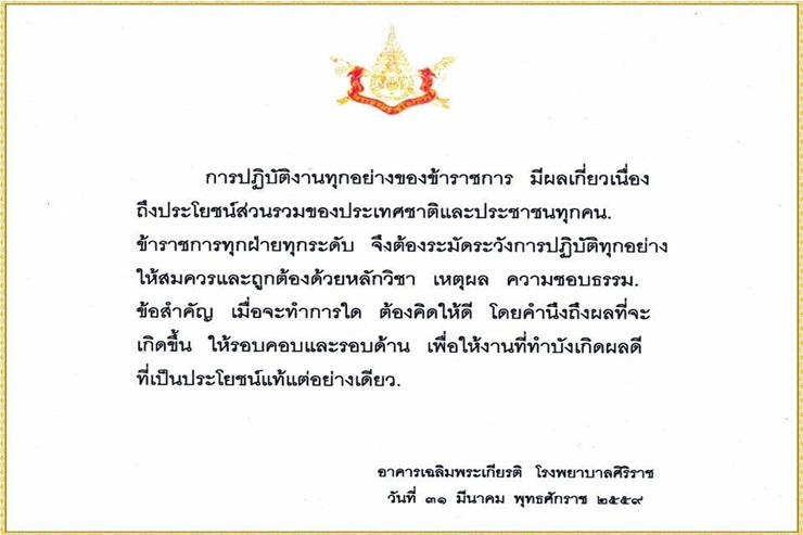 "การปฏิบัติงานทุกอย่างของข้าราชการ มีผลเกี่ยวเนื่องถึงประโยชน์ส่วนรวมของประเทศชาติและประชาชนทุกคน ข้าราชการทุกฝ่ายทุกระดับ จึงต้องระมัดระวังการปฏิบัติทุกอย่าง ให้สมควรและถูกต้องด้วยหลักวิชา เหตุผล ความชอบธรรม ข้อสำคัญ เมื่อจะทำการใด ต้องคิดให้ดี โดยคำนึงถึงผลที่จะเกิดขึ้น ให้รอบคอบและรอบด้าน เพื่อให้งานที่ทำบังเกิดผลดี ที่เป็นประโยชน์แท้แต่อย่างเดียว"