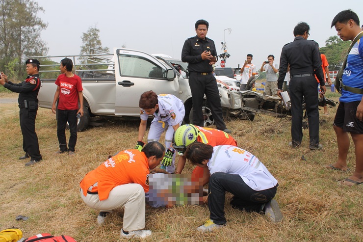 หนุ่มขับกระบะรับซื้อไก่สดถูกรถไฟพุ่งชนขณะข้ามจุดตัดรางรถไฟที่กำลังติดตั้ง รถพังยับส่วนคนขับได้รับบาดเจ็บสาหัส