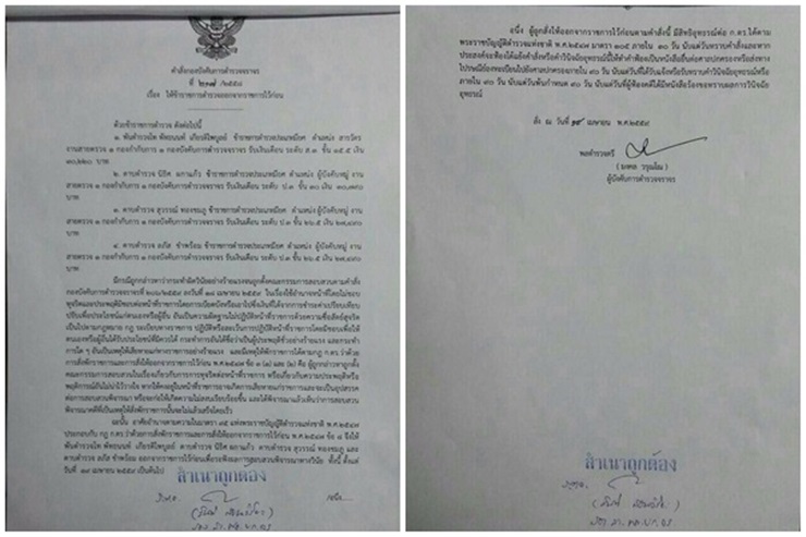 ฉะนั้น อาศัย อำนาจตามความในมาตรา 95 แห่งพระราชบัญญัติตำรวจแห่งชาติพ.ศ. 2547 ประกอบกับกฎ ก.ตร. ว่าด้วย การสั่งพักราชการ และการให้ออกจากราชการไว้ก่อนพศ 2547 ข้อ 8 จึงให้ พ.ต.ท.พัทธนนท์ เกียรติไพบูลย์ ด.ต.นิธิศ ผกาแก้ว ด.ต.สุวรรณ์ ทองชมพู และ ด.ต.ลภัส ขำพร้อม ออกจากราชการไว้ก่อน เพื่อรอฟังผลการสอบสวนพิจารณาทางวินัยทั้งนี้ ตั้งแต่วันที่ 19 เม.ย.2559 เป็นต้นไป