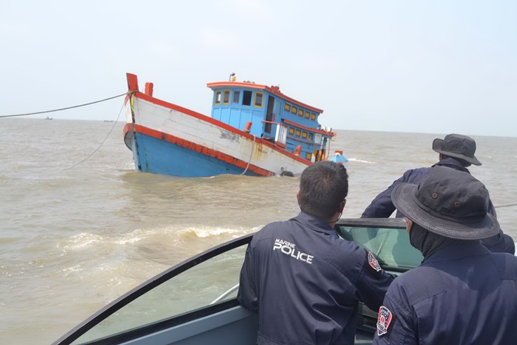 เมื่อวันที่ 28 เม.ย.59 เวลา 11.30 น. ร.ต.ท.องอาจ ชั่งชั่ว รองสารวัตรสถานีตำรวจน้ำ 3 กองกำกับการ 4 กองบังคับการตำรวจน้ำสมุทรปราการ ได้รับแจ้งจากศูนย์ควบคุมประมงจังหวัดสมุทรปราการว่า มีเรือลากจูงถูกคลื่นลมพายุฤดูร้อนซัดจนเรือแตกจมอยู่กลางทะเลปากอ่าวห่างจากฝั่งประมาณ 3 ไมค์ทะเล พื้นที่ตำบลบางปูใหม่ จึงนำกำลังพร้อมเรือตรวจการณ์ รน.58 ออกตรวจสอบ