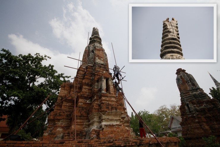 อยุธยา - เจ้าหน้าที่กรมศิลกาปรเข้าซ่อมแซมยอดเจดีย์ราย ใกล้วัดภูเขาทองที่ได้รับความเสียหายจากฟ้าผ่า