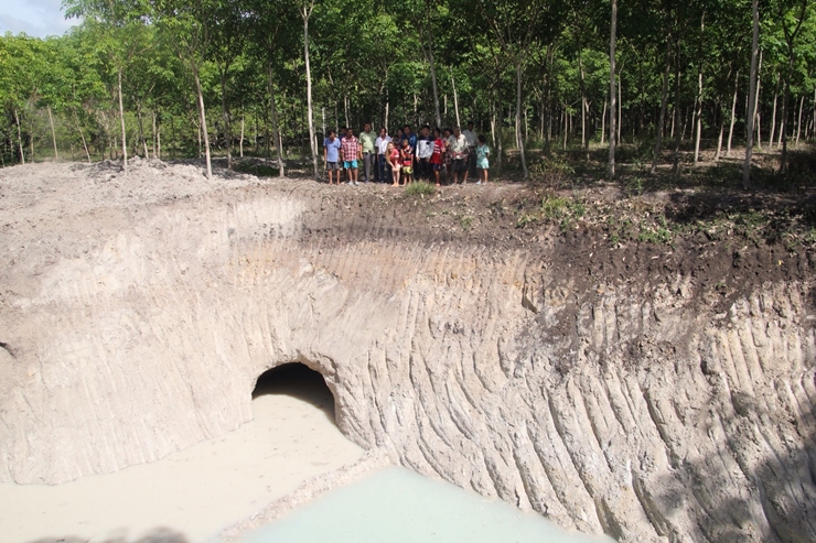 ตื่นขุดพบโพรงขนาดใหญ่มีน้ำสีเขียวไหลทะลักกลางสวนยางพารา
