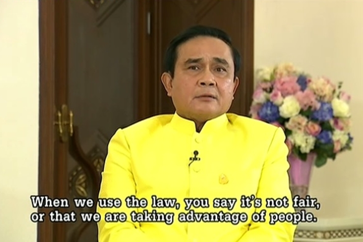 “ผมบอกแล้ว ผมไม่ใช่คนที่อยากใช้อำนาจกับใครสงสารเขา แต่บางคนก็ไม่น่าสงสารนะ ประชาชนก็ต้องแยกให้ออกนะ อย่าไปให้เขาปลุกระดมต่างประเทศ ต้องช่วยกันพูดซิ นี่พอเขาพูดก็พูดตาม ขยายข่าวเขาไปเรื่อย ก็เท่ากับคนก็รับรู้มากขึ้น ผมพูดคนเดียว ทางโน้นพูดเป็นร้อยคน ผมจะสู้ไหวไหมเล่า แล้วประเทศก็วุ่นวาย ที่เขาประเมินไว้ก็แย่ลง การลงทุนทำให้ดีขึ้น ก็ดีไม่ได้หรอกทั้งหมดนี่เพราะใครล่ะ ไปหามาให้เจอนะ เราต้องสร้างทั้งในประเทศ ต่างประเทศ ในประเทศต้องสงบ ต่างประเทศเชื่อมั่น ให้เหมาะกับการลงทุนขนาดใหญ่เวลานานๆ ต่อไปวันหน้าผมบอกว่าการลงทุนไม่ใช่ 5 ปี – 10 ปี 20 ปี ลูกหลานเขาเข้ามาตั้งบริษัทในประเทศไทย เขาก็ส่งทอดไปเรื่อยๆ” พล.อ.ประยุทธ์