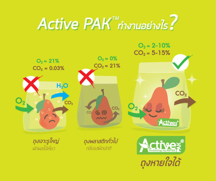 วิชชุดา เดาด์ นักวิจัยและผู้จัดการกลุ่มผลิตภัณฑ์ ActivePAKTM เอ็มเทค สวทช. อธิบายว่า ผักและผลไม้ที่เก็บเกี่ยวจากต้นมาแล้วนั้นยังมีการหายใจอยู่ หรือยังมีชีวิตอยู่เหมือนกับที่ยังติดอยู่กับต้น ซึ่งการหายใจของผักและผลไม้ก็เหมือนกับการหายใจของคนเรา คือหายใจเอาก๊าซออกซิเจนเข้าไปและปล่อยก๊าซคาร์บอนไดออกไซด์และคายน้ำออกมา ทำให้เกิดการเสื่อมสภาพและเน่าเสีย