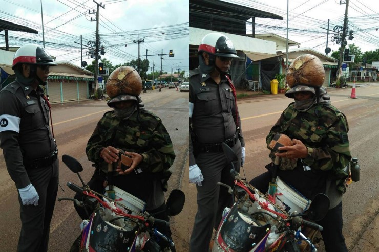 ตำรวจเรียกปรับ ชายใส่แจ็คเก็ตทหาร ใช้มะพร้าวเป็นหมวกกันน็อค