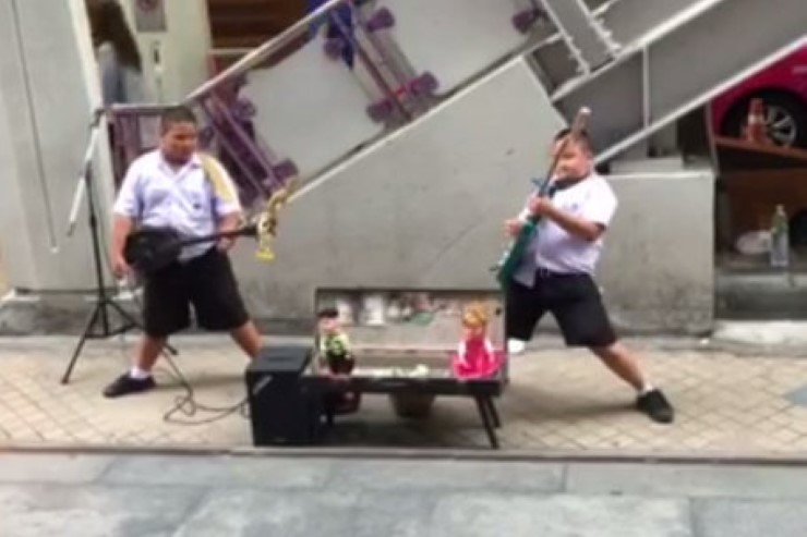 สองหนุ่มน้อยวัยประถมเล่นดนตรีเปิดหมวกข้างถนน ประชันกีตาร์ไฟฟ้า-พิณ มันสุดเหวี่ยง