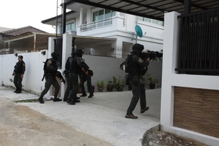 ทั้งนี้บ้านดังกล่าวเป็นบ้านเดี่ยว 2 ชั้น เนื้อที่กว่า 200 ตร.วา มีรั้วรอบขอบชิดสูงกว่า 3 เมตร มีทางเข้าออก 2 รวมทั้งมีตัวบ้านอีก 2 หลังอยู่ในพื้นที่เดียวกัน ทางเจ้าหน้าที่กระจายกำลังปิดล้อมบ้านหลังดังกล่าวตามยุทธวิธี พร้อมแสดงหมายค้นและใช้เครื่องขยายเสียงเจรจาให้ผู้อยู่ในบ้านเปิดประตู แต่ผู้อยู่ในบ้านไม่ยอมเปิดประตู โดยใช้เวลานานเกือบ 1 ชั่วโมง ก่อนที่ ชุดคอมมานโดจึงใช้อุปกรณ์เหล็กกระทุ้งประตูรั้ว ก่อนที่จะมีผู้อยู่ในบ้านจะยอมเดินออกมาเปิดประตู ให้ชุดคอมมานโดเข้าเคลียร์พื้นที่ และเข้าตรวจสอบภายในบ้าน จากการสอบถามแม่บ้านซึ่งรับเป็นผู้ดูแลบ้านเปิดเผยว่า บ้านหลังดังกล่าวมีคนงานพักอาศัย 6 คน โดยทางเจ้าของบ้านไม่อยู่เดินทางไปที่อ.แม่สอด จ.ตาก เจ้าหน้าจึงขอให้ผู้อยู่ในบ้านแสดงตัวแต่ปรากฏว่ามีคนงานเป็นชาวต่างด้าว 5 คนปรากฏตัว เป็นชาย 3 คน หญิง 2 คน เจ้าหน้าทีจึงได้กำลังค้นหาโดยรอบ กระทั่งพบคนงานชายชาวพม่าหลบหนีอยู่ใต้ถุนบ้าน จึงได้คุมตัว ก่อนทำการตรวจค้นภายในบ้าน เบื้องต้นพบรถยนต์หรูหลายคัน อาทิรถยนต์ยี่ห้อบีเอ็มดับบิว 2คันรถยนต์ยี่ห้อโตโยต้า รุ่น ฟอร์จูนเนอร์ 1 คัน และรถยนต์กระบะยี่ห้อ โตโยต้า 1 คัน อีกทั้งให้เจ้าหน้าที่กองพิสูจน์หลักฐานเข้าตรวจสอบภายในบ้านเพื่อหาเอกสารหลักฐาน ร่วมกับเจ้าหน้าที่ ปปง.เพื่อหาความเชื่อมโยงเครือข่ายยาเสพติด