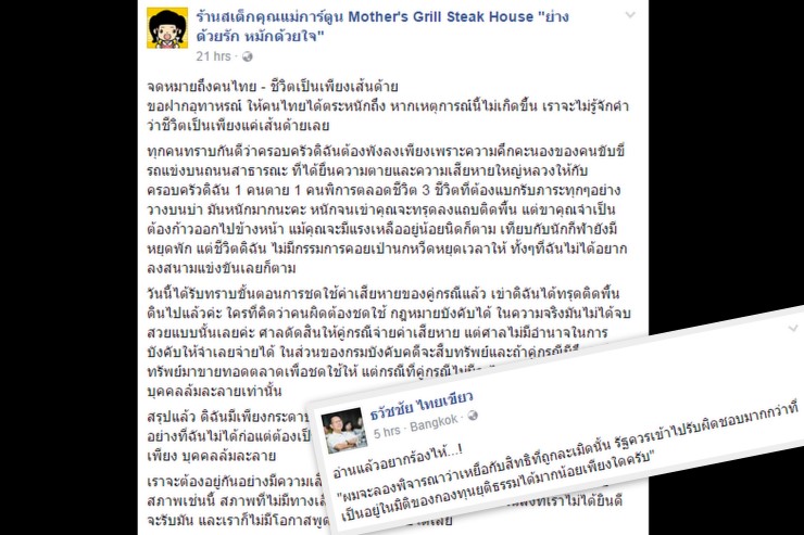 ทั้งนี้มารดาของน้องการ์ตูนได้โพสต์ข้อความผ่านเฟซบุ๊ก ร้านสเต็กคุณแม่การ์ตูน Mother's Grill Steak House "ย่างด้วยรัก หมักด้วยใจ" ระบุถึงเรื่องที่เกิดขึ้นดังนี้