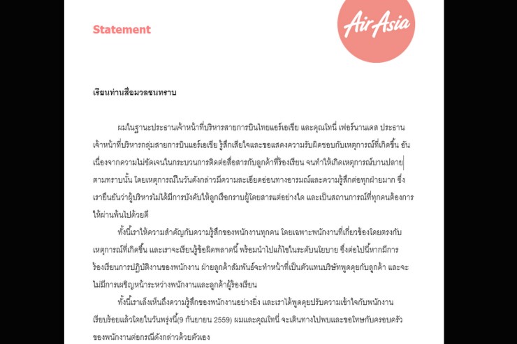 "เหตุการณ์ในวันดังกล่าวมีความละเอียดอ่อนทางอารมณ์และความรู้สึกต่อทุกฝ่ายมาก ซึ่งเรายืนยันว่าผู้บริหารไม่ได้มีการบังคับให้ลูกเรือกราบผู้โดยสารแต่อย่างใด เเละเป็นสถานการณ์ที่ทุกคนต้องการให้ผ่านพ้นไปด้วยดี"