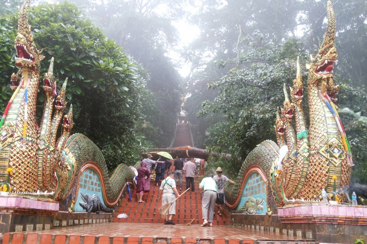 เมื่อวันที่14ก.ย.59นายไพรินทร์ ลิ่มเจริญ หัวหน้าสำนักงานป้องกันและบรรเทาสาธารณภัยจังหวัดเชียงใหม่เปิดเผยว่า อิทธิพลจากพายุดีเปรสชั่น"ราอี" ส่งผลให้เกิดฝนตกหนักร้อยละ90ของพื้นที่ โดยเมื่อเวลา 05.30 น.ที่ผ่านมา ต้นสนขนาดใหญ่ อายุร้อยปี ได้ล้มพาดช่วงต้นลำตัวพญานาคของบันไดขึ้นดอยสุเทพ เจ้าหน้าที่จากหน่วยงานที่เกี่ยวข้องได้ช่วยกันเก็บกู้ซากเสร็จแล้ว พร้อมเปิดให้นักท่องเที่ยวได้ขึ้นชมวัดได้ตามปกติ แต่ก็แจ้งเตือนให้นักท่องเที่ยวระมัดระวังในการเดินทางระยะนี้ไปด้วย