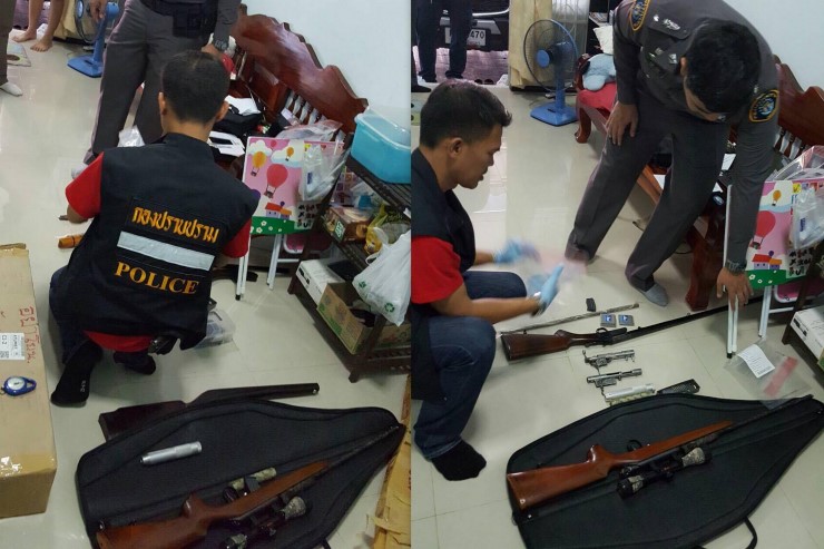 จากการตรวจสอบพบนายวันทวี วิเศษยา อายุ 38 ปี แสดงตนเป็นเจ้าของบ้าน และจากการตรวจค้นพบอาวุธปืนลูกซองยาว 1 กระบอก ไม่มีทะเบียน อาวุธปืนยาว ขนาด.22 1 กระบอก ชุดลั่นไก 2 ชุด ลำกล้องขนาด .22 จำนวน 1 อัน กระสุนปืนขนาด .22 จำนวน 7 นัด ปลอกกระสุนปืน ขนาด .22 จำนวน 8 ปลอก แมกกาซีนปืนขนาด.22 จำนวน 1 อัน และปลายกระบอกปืนแบบเก็บเสียง จำนวน 2 อัน ซุกซ่อนอยู่ใต้ฟูกที่นอน จึงยึดไว้เป็นของกลาง