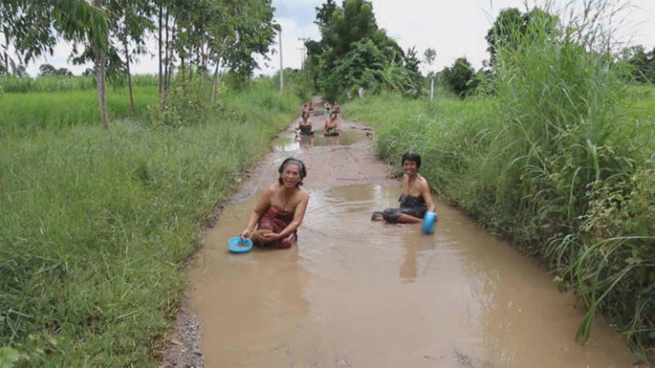 กลายเป็นเรื่องแชร์กันสนั่นโลกโซเชียล ดังไกลข้ามโลก เมื่อมีสาวชาวกะเหรี่ยง จ.ตาก โพสต์รูปอาบน้ำกลางถนนที่เป็นหลุมเป็นบ่อ จนกลายเป็นกระแสในโลกโซเชียล ต่อมามีคุณยายประมาณ 10 คน ซึ่งเป็นชาวบ้าน จ.ขอนแก่น ได้นุ่งกระโจมอก ออกมานั่งแช่น้ำที่ขังบนถนนเป็นหลุมเป็นบ่อ เพื่อจะเรียกความสนใจให้ทางการมาสนใจปรับปรุงซ่อมแซมถนนที่ทรุดโทรมมานานกว่า 30 ปี และภาพการอาบน้ำกลางถนนดังไกลไปถึงองค์การสหประชาชาติ (ยูเอ็น) ร้อนถึง พล.อ.ประยุทธ์ จันทร์โอชา นายกรัฐมนตรี ออกมาตำหนิว่าไม่ควรให้มีอีก อย่านำไปทำกันเป็นเรื่องสนุก เนื่องจากภาพผู้หญิงนุ่งกระโจมอกอาบน้ำกลางถนนภาพนั้นไปถึงยูเอ็นแล้ว กลายเป็นเรื่องที่อาจสร้างความน่าอายให้แก่ประเทศได้