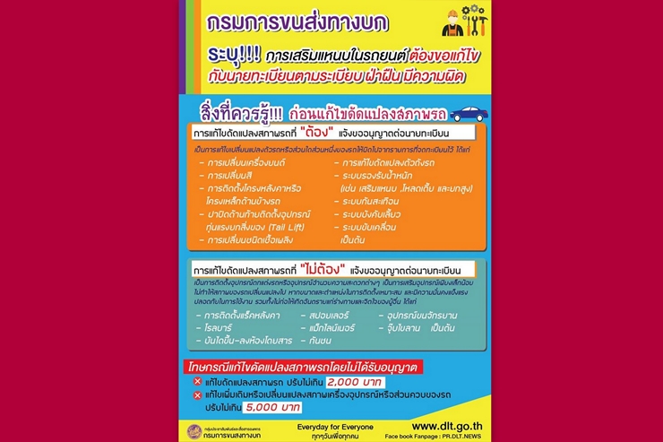 นายณันทพงศ์ เชิดชู รองอธิบดีกรมการขนส่งทางบก เปิดเผยว่า เพื่อความปลอดภัยของตัวรถและการใช้งาน บนท้องถนน การแก้ไขดัดแปลงตัวรถหรือส่วนใดส่วนหนึ่งของรถให้ผิดไปจากรายการที่จดทะเบียนไว้ โดยเฉพาะกรณีที่ การดัดแปลงนั้นส่งผลต่อความมั่นคงแข็งแรงของตัวรถและความปลอดภัยในการใช้งาน หรือติดตั้งเพื่อใช้บรรทุกสิ่งของให้ได้ปริมาณที่มากขึ้น ต้องได้รับอนุญาตจากกรมการขนส่งทางบกก่อนนำรถไปใช้งาน เนื่องจากการแก้ไขดัดแปลงดังกล่าวอาจก่อให้เกิดอันตรายและเป็นสาเหตุของอุบัติเหตุได้ เช่น การติดตั้งโครงหลังคาหรือโครงเหล็กด้านข้างรถ ฝาปิดด้านท้ายติดตั้งอุปกรณ์ทุ่นแรงยกสิ่งของ (Tail Lift) การเปลี่ยนเครื่องยนต์ หรือการเปลี่ยนชนิดเชื้อเพลิง รวมถึงการแก้ไขดัดแปลงตัวถังรถ ระบบรองรับน้ำหนัก เสริมแหนบ ระบบกันสะเทือน ระบบบังคับเลี้ยว หรือระบบขับเคลื่อน เป็นต้น เจ้าของรถต้องนำรถเข้ารับการตรวจสภาพพร้อมกับดำเนินการแจ้งแก้ไขลักษณะรถในเอกสารคู่มือจดทะเบียนรถ เพื่อขออนุญาตจากนายทะเบียนก่อนนำรถไปใช้ โดยแสดงหลักฐาน ได้แก่ การได้มาของอุปกรณ์ที่นำมาดัดแปลงรถหรือบันทึกถ้อยคำรับรองว่าอุปกรณ์ดังกล่าวได้มาโดยถูกต้องและสุจริต เช่น ใบเสร็จค่าชิ้นส่วน อุปกรณ์ ค่าแรง และหนังสือรับรองจากวิศวกร สาขาเครื่องกลหรือยานยนต์ นายทะเบียนจะบันทึกรายการในคู่มือจดทะเบียนรถไว้เป็นหลักฐานประกอบการตรวจสอบต่อไป โดยเจ้าของรถสามารถแสดงคู่มือจดทะเบียนรถหรือสำเนาเก็บไว้ประจำรถเพื่อแสดงเป็นหลักฐาน
