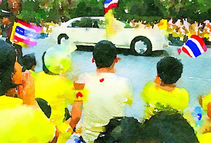 ครั้งหนึ่ง แม่กำลังเดินจูงมือเขาอยู่แถวอนุสาวรีย์ชัยสมรภูมิ ตำรวจยืนจังก้าตามปากซอย ถนนว่างโล่ง แม่พูดพึมพำขึ้นว่า ขบวนเสด็จฯ เขาเห็นชาวบ้านยืนเต็มฟุตปาท ไม่นานรถมอเตอร์ไซค์เปิดสัญญาณไซเรนก็แล่นนำ ตามด้วยขบวนรถยนต์คันใหญ่วิ่งมาเป็นแถว ทันทีที่รถสีครีมติดกระจกใสแจ๋วผ่านมาใกล้ มีผู้ชายใส่แว่นคนหนึ่งที่นั่งบนเบาะหลังโบกมือส่งยิ้มมาให้ เท่านั้นล่ะเสียงทรงพระเจริญก็ดังเซ็งแซ่