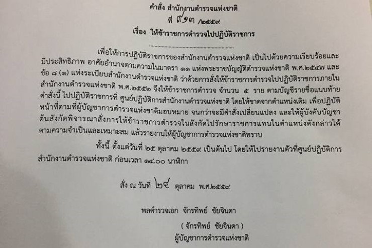ทั้งนี้ ตั้งแต่วันที่ 25 ต.ค. 2559 เป็นต้นไป โดยให้รายงานตัวที่ ศูนย์ปฏิบัติการสำนักงานตำรวจแห่งชาติ ก่อนเวลา 14.00 น.