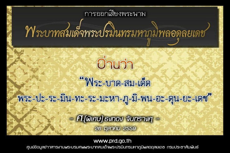 เมื่อวันที่ 26 ต.ค. ศูนย์ข้อมูลข่าวสารงานพระบรมศพ พระบาทสมเด็จพระปรมินทรมหาภูมิพลอดุลยเดช กรมประชาสัมพันธ์ ได้ชี้แจงการออกเสียงพระนาม พระบาทสมเด็จพระปรมินทรมหาภูมิพลอดุลยเดช อย่างถูกต้อง โดย ศ.(พิเศษ)ธงทอง จันทรางศุ