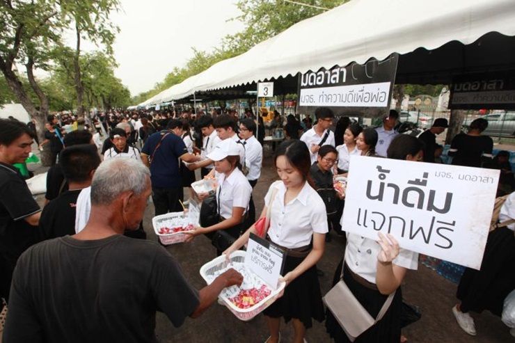 เกือบ 3 สัปดาห์ที่สายธารน้ำใจจำนวนมากจากหน่วยงานภาครัฐ และประชาชนไหลมารวมตัวกันอยู่ที่มณฑลพิธีท้องสนามหลวง เพื่อนำอาหาร น้ำดื่ม สิ่งของ และบริการต่างๆ มาแจกจ่ายให้กับประชาชน ที่เดินทางมาแสดงความไว้อาลัยแด่พระบาทสมเด็จพระปรมินทรมหาภูมิพลอดุลยเดช