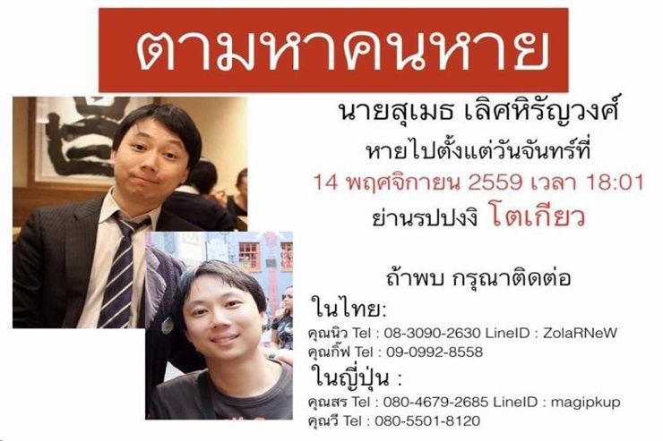 รมว.ต่างประเทศ ยอมรับตามตัว "สุเมธ" คนไทยหายตัวในญี่ปุ่น ยังไม่มีความคืบหน้า สถานทูตเตรียมพบพ่อแม่ วันนี้ 14.30 น. ล่าสุด เพจ เฟซบุ๊ก FindSumeth แจ้งว่า พบตัวแล้ว