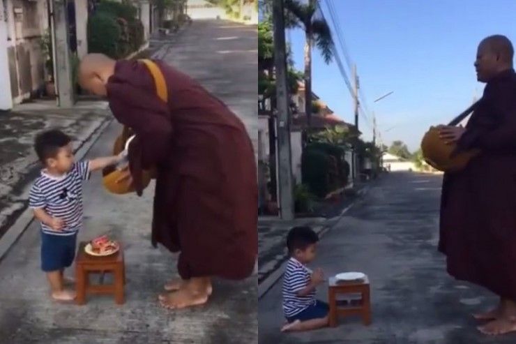 โดยเพจเฟซบุ๊กชื่อ “คลิปดังเฟซบุ๊ก” ได้โพสต์คลิปวิดีโอของเด็กชายตัวน้อยรายหนึ่งกำลังยืนใส่บาตรหน้าบ้านตอนเช้า ขณะนั้นมีพระสงฆ์เดินบิณฑบาตผ่านมาพอดีจึงหยุดรับ จากนั้นหนูน้อยก็บรรจงหยิบอาหารเครื่องดื่มใส่บาตรของหลวงพ่ออย่างตั้งใจ ก่อนที่จะนั่งพับเพียบลงกับพื้นแล้วพนมมือรับพร พฤติกรรมทั้งหมดเปี่ยมด้วยความนอบน้อม ถึงขั้นที่หลวงพ่ออดไม่ไหวต้องเอ่ยปากชมว่า “เก่งจังเลย”