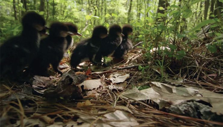 ส่วนแม่เป็ดเมอร์แกนเซอร์ท้ายทอยดำ (Hooded merganser) เลือกไม่ทำรังใกล้น้ำเหมือนแม่นกกระจอกซอลต์มาร์ช แต่ลงทุนเดินเข้าป่าไปหาโพรงบนต้นไม้สูงที่นกหัวขวานหรือสัตว์อื่นๆ เคยทำไว้ เมื่อได้โพรงที่เหมาะๆ แม่เป็ดจะเข้าไปทำรังโดยบุก้นโพรงให้นุ่มหนาด้วยขนที่ถอนจากแผงอก รังที่มิดชิด อยู่สูง ปลอดภัยจากนักล่า ช่วยให้แม่เป็ดวางไข่ได้อย่างสบายใจ สี่ถึงห้าสัปดาห์ผ่านไป ลูกเป็ดฟักออกจากไข่ แม่เป็ดจะทิ้งรังบินไปคอยลูกน้อยอยู่ในบึงน้ำ แล้วส่งเสียงร้องเรียกลูกๆ ให้ออกมาจากรัง ลูกเป็ดได้ยินเสียงแม่ อยากไปหา แต่พวกมันยังบินไม่ได้ ลูกเป็ดปีนขึ้นไปยังปากโพรงที่อยู่สูงจากพื้นดินหลายเมตร ณ จุดนี้ พวกมันต้องตัดสินใจกระโดดลงไป เมื่อทุกตัวลงมาครบแล้วก็จะชักแถวเดินตามเสียงไปหาแม่ที่บ้านใหม่ในบึงน้ำ