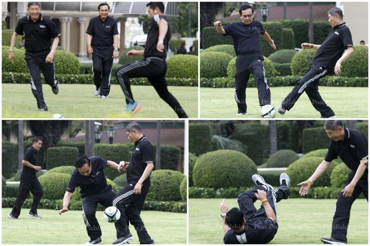 เมื่อวันที่ 14 ธ.ค. พล.อ.ประยุทธ์ จันทร์โอชา นายกรัฐมนตรี นำคณะรัฐมนตรีและข้าราชการประจำทำเนียบรัฐบาลออกกำลังกายที่บริเวณหน้าตึกไทยคู่ฟ้า สอดคล้องกับมติคณะรัฐมนตรีที่สนับสนุนให้ข้าราชการทั่วประเทศ หันมาออกกำลังในวันพุธเป็นเวลา 1 ชั่วโมง ในช่วงเวลาตั้งแต่ 15.00-16.00 น. โดยวันนี้พล.อ.ประยุทธ์ได้เตะฟุตบอลร่วมกับข้าราชการที่สนามหญ้า ซึ่งระหว่างการเล่น นายกฯได้ถูก พล.อ.วิลาศ อรุณศรี เลขาธิการนายกรัฐมนตรี ซึ่งเป็นเพื่อนร่วมรุ่นเตรียมทหารรุ่น12 ของพล.อ.ประยุทธ์ เข้าพยายามสกัดบอลทำให้พล.อ.ประยุทธ์เสียหลักล้มไปบนสนามหญ้า ท่ามกลางบรรยากาศที่เป็นไปด้วยความสนุกและผ่อนคลาย