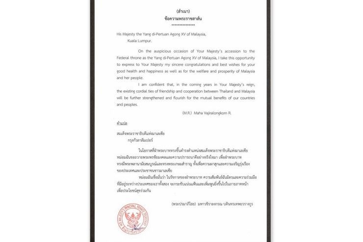 ในหลวงร.10ทรงมีพระราชสาส์นแสดงความยินดีสมเด็จพระราชาธิบดีมาเลเซีย
