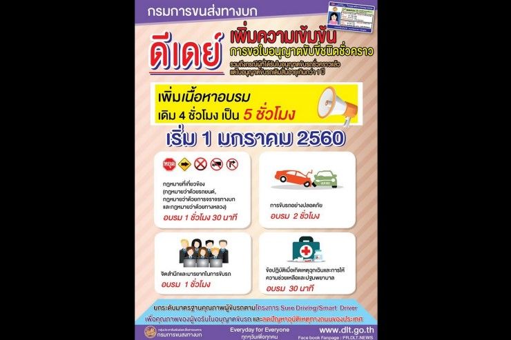 กรมการขนส่งทางบกเพิ่มเวลาอบรมใบขับขี่ชนิดชั่วคราวเป็น 5 ชั่วโมง เริ่ม 1 ม.ค.2560 นี้เป็นต้นไป