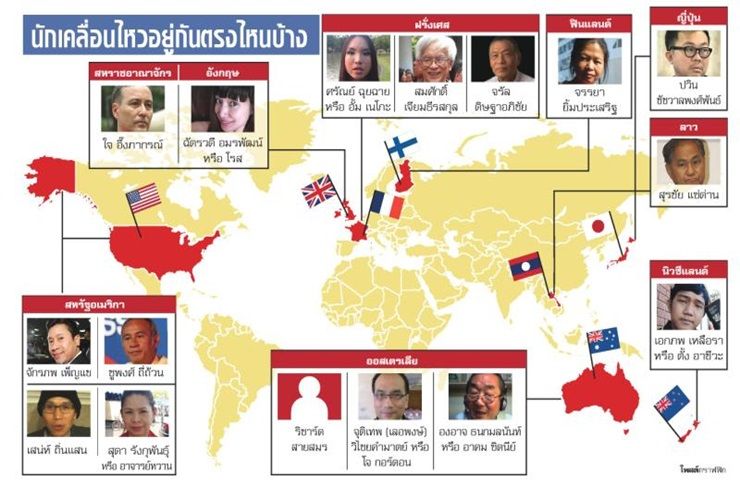 ประเทศลาว อิทธิพล สุขแป้น หรือดีเจเบียร์ แกนนำเสื้อแดงเชียงใหม่, วัฒน์ วรรลยางกูร, วุฒิพงศ์ กชธรรมคุณ หรือ โกตี๋, ชูชีพ ชีวสุทธิ์ หรือ ชีพ ชูชัย, ธันย์ฐวุฒิ ทวีวโรดมกุล หรือ หนุ่ม เรดนนท์, พิพัฒน์ พรรณสุวรรณ, นิธิวัต วรรณศิริ, ชฤต โยนกนาคพันธุ์ หรือ โยนก ไฟเย็น, ชัยอนันต์ ไผ่สีทอง หรือ อุ๊ ไฟเย็น, ไตรรงค์ สินสืบวงศ์ หรือ ขุนทอง ไฟเย็น, วันเฉลิม สัตย์ศักดิ์สิทธิ์ เป็นต้น ส่วนใหญ่ยังคงเคลื่อนไหวผ่านเฟซบุ๊กและยูทูบ