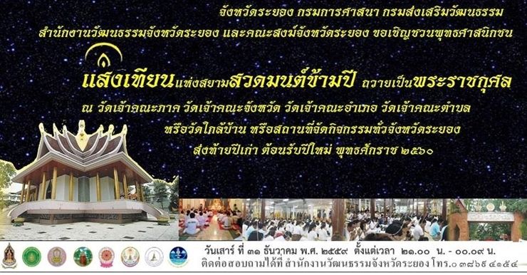 ระยอง-ผู้ว่าฯระยองเชิญชวนพุทธศาสนิกชน สวดมนต์ข้ามปีพร้อมกันทุกวัดใน 8 อำเภอเริ่มเวลา 20.00น.ของวันที่ 31ธันวาคม 2559 – 1 มกราคม 2560