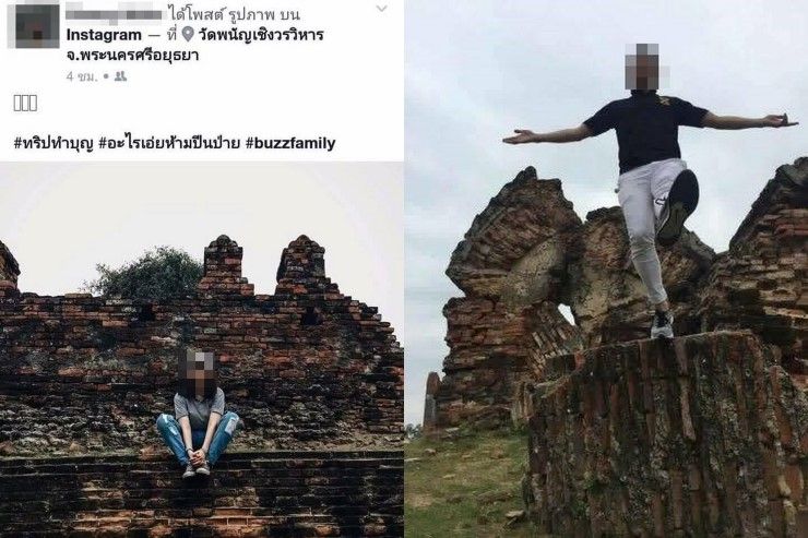 โดยเพจเฟซบุ๊ก ควาย+Social V.3 ได้เผยแพร่ภาพถ่ายของนักท่องเที่ยวชายหญิงกลุ่มหนึ่งกำลังปีนขึ้นไปถ่ายรูปบนโบราณสถานภายในวัดพนัญเชิงวรวิหาร จ.พระนครศรีอยุธยา ซึ่งเป็นวัดเก่าแก่มีชื่อเสียงมายาวนานนับร้อยปี ทั้งที่ทางวัดมีกฎระเบียบเขียนไว้ชัดเจนว่าห้ามปีนป่ายเจดีย์ พระพุทธรูป ปรางค์ กำแพง และแท่นต่างๆ