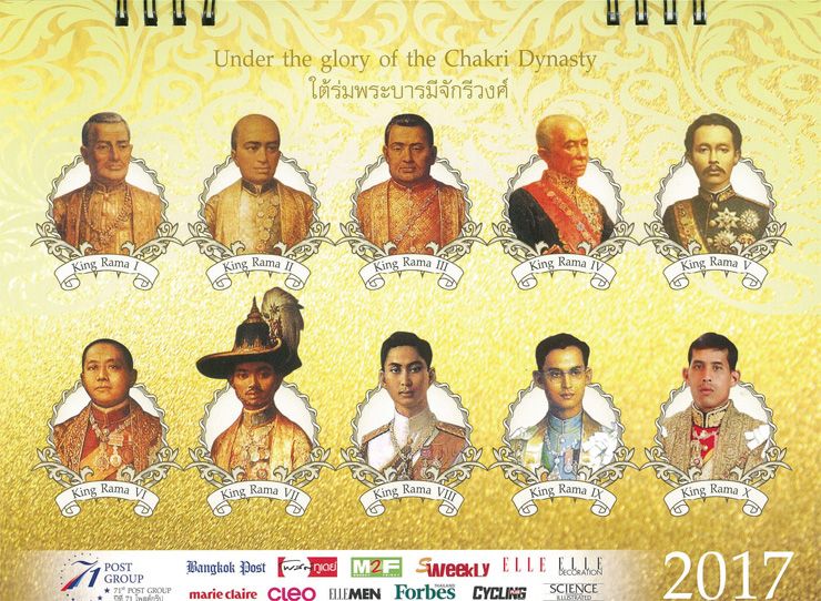 ลำดับแรกคือปฏิทินของบริษัท โพสต์ พับลิชชิง ที่เล่าเรื่องพระมหากษัตริย์ในหัวข้อ ใต้ร่มพระบารมีจักรีวงศ์ โดยเล่าความเป็นมาของคำว่าจักรี ว่ามาจากพ้องเสียงกับคำว่า จักรและตรี ซึ่งเป็นเทพศาสตราวุธของพระวิษณุและพระศิวะ รัชกาลที่ 1 จึงทรงให้สร้างพระแสงจักรและพระแสงตรี 1 สำรับ และกำหนดให้เป็นสัญลักษณ์และกำหนดให้ใช้เป็นสัญลักษณ์ประจำพระราชวงศ์จักรีสืบมาถึงปัจจุบัน และบอกว่ายุครัตนโกสินทร์เจริญรุ่งเรืองเข้าสู่ปีที่ 235 ณ ปี 2560 ภายใต้ร่มพระบารมีของพระมหากษัตริย์แห่งราชวงศ์จักรี ทรงนำพาประเทศผ่านพ้นอุปสรรคและวิกฤตต่างๆ ณ ปัจจุบันราชอาณาจักรไทยเข้าสู่รัชสมัยของรัชกาลที่ 10