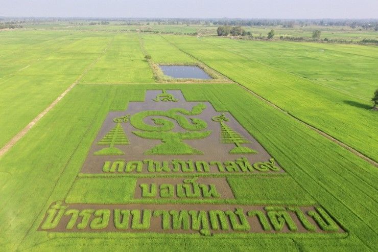 เกษตรกรใน อ.คีรีมาศ จ.สุโขทัย ปลูกแปลงนาเป็นภาพเลข๙ พร้อมข้อความ "เกิดในรัชกาลที่ ๙ ขอเป็นข้ารองบาททุกชาติไป"