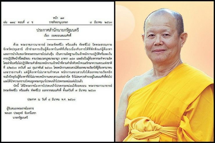 ราชกิจจาฯเผยแพร่ประกาศสำนักนายกฯระบุ มีพระราชโองการโปรดเกล้าฯให้ถอดถอน "พระทัตตชีโว" ออกจากสมณศักดิ์ หลังไม่มารายงานตัวตามหมายเรียก
