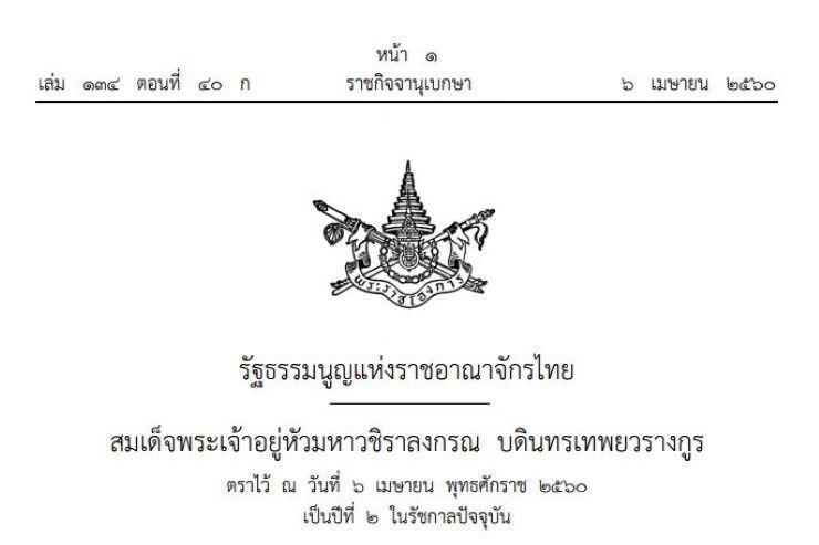 เมื่อวันที่ 6 เม.ย. ราชกิจจานุเบกษา ได้เผยแพร่ รัฐธรรมนูญแห่งราชอาณาจักร พุทธศักราช 2560 ถือเป็นรัฐธรรมนูญฉบับที่ 20 ของประเทศไทย มีเนื้อหาทั้งหมด 279 มาตรา