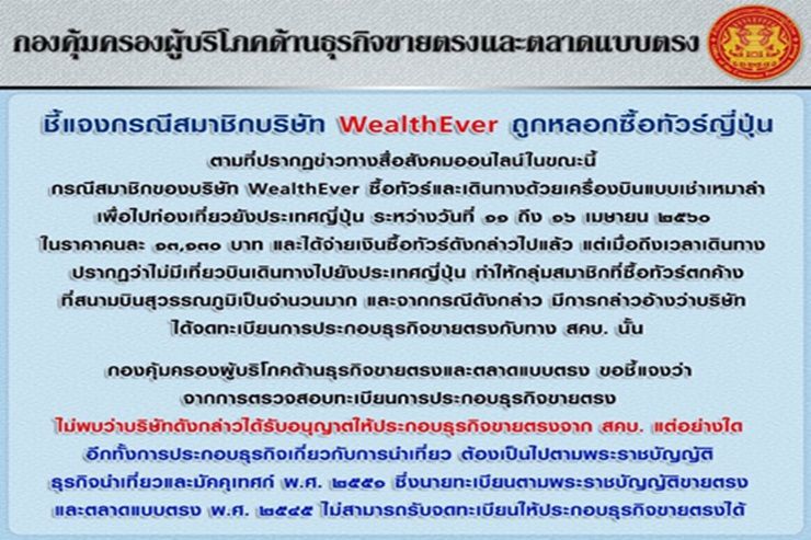 สคบ. แจง กรณีสมาชิกบริษัท WealthEver ถูกหลอกซื้อทัวร์ญี่ปุ่นลอยแพนับพันคนไม่พบว่าได้รับอนุญาตให้ประกอบธุรกิจขายตรง