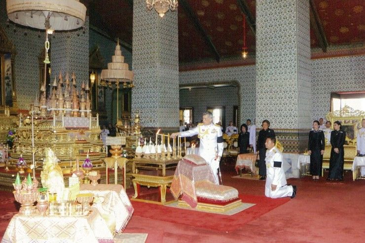 เวลา 17.55 น. สมเด็จพระเจ้าอยู่หัว เสด็จพระราชดำเนินโดยรถยนต์พระที่นั่งจากพระที่นั่งอัมพรสถาน พระราชวังดุสิต ไปยังวัดพระศรีรัตนศาสดาราม เจ้าพนักงานกราบบังคมทูลรายงานเครื่องราชสักการะที่ทรงพระราชอุทิศพระราชทานให้กระทรวงมหาดไทยเชิญไปถวายเป็นพุทธบูชาปูชนียสถานต่างๆ แล้วเสด็จพระราชดำเนินเข้าพระอุโบสถ ทรงพระสุหร่าย สรงพระพุทธมหามณีรัตนปฏิมากร พระสัมพุทธพรรณี พระพุทธยอดฟ้าจุฬาโลก พระพุทธเลิศหล้านภาลัย ทรงจุดธูปเทียนถวายนมัสการ แล้วเสด็จพระราชดำเนินไปสรงน้ำปูชนียวัตถุตามเจดียสถานในพระอารามนี้ แล้วเสด็จพระราชดำเนินเข้าหอพระนาก ทรงจุดธูปเทียนถวายราชสักการะพระบรมอัฐิพระบาทสมเด็จพระปิ่นเกล้าเจ้าอยู่หัว พระอัฐิสมเด็จพระบวรราชเจ้า และทรงทอดผ้าคู่ พระสงฆ์ 5 รูป สดับปกรณ์แล้ว ทรงทอดผ้าคู่พระสงฆ์อีก 40 รูป สดับปกรณ์พระอัฐิพระราชวงศ์ พระสงฆ์ถวายอนุโมทนา ถวายอดิเรก เป็นเสร็จสิ้นพระราชพิธี
