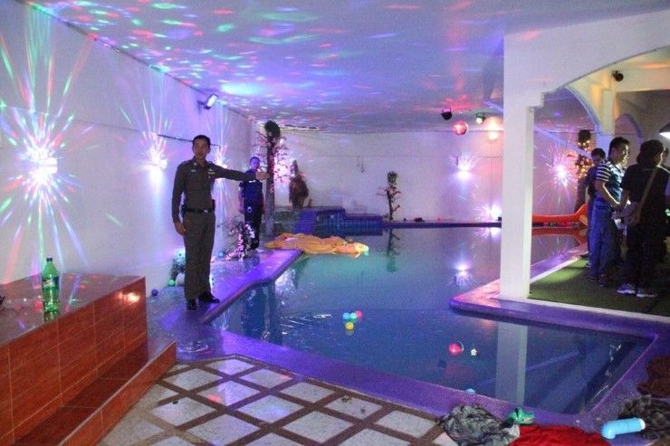 เบื้องต้นจากการตรวจสอบพบว่าบ้านหลังดังกล่าวมีลักษณะเป็นบ้าน 2 ชั้น พื้นที่ประมาณ 50 ตารางวา ตั้งอยู่บริเวณท้ายซอยของหมู่บ้าน ซึ่งมีรั้วบ้านขาดความสูงกว่า 2 เมตร โดยพบรถยนต์เก๋ง และกระบะแต่งซิ่งจอดอยู่บริเวณที่จอดรถจำนวน 4 คัน ด้านนอกอีก 2 คัน ขณะที่บริเวณด้านข้างของบ้านถูกต่อเติมใหม่กั้นเป็นห้องขนาดใหญ่ จึงเข้าตรวจสอบโดยพบว่าภายในมีลักษณะเป็นสระว่ายน้ำที่ตกแต่งด้วยไฟ แสงสี ติดเครื่องปรับอากาศหรูหรา โดยมีวัยรุ่นชายหญิงกำลังมั่วสุมกันอยู่จำนวน 28 ราย แยกเป็นชาย 16 ราย หญิง 12 ราย จึงควบคุมตัวไว้