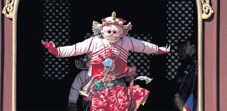 ในสารบบพิธีกรรมวัชรยานทิเบตมีพิธีกรรมหนึ่งเรียกว่า “ระบำกะโหลก” นอกจากจะมีนัยทางธรรมแล้ว ยังมีความเกี่ยวข้องกับพระปัทมสมภพ หรือปัทมสัมภวะมหาคุรุผู้ประกาศพุทธศาสนาในทิเบตอีกด้วย ตำนานเล่าว่า พระเจ้าอินทรภูติพระบิดาเลี้ยงได้สละราชบัลลังก์ให้พระปัทมสมภพ แต่ท่านไม่ไยดีในโลกธรรม ทั้งยังประพฤติตนให้ผู้คนฉงนฉงายอยู่ตลอดเวลา